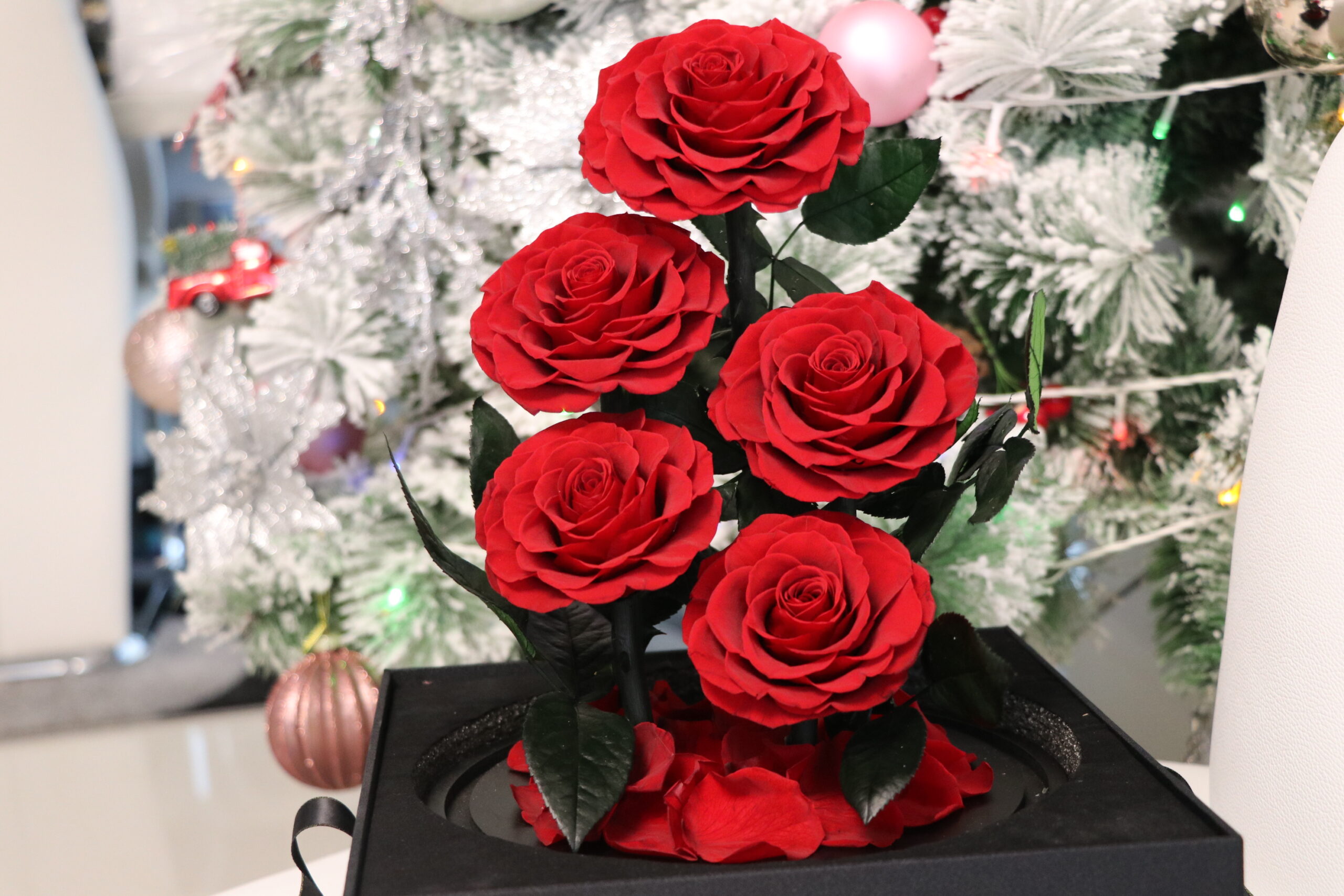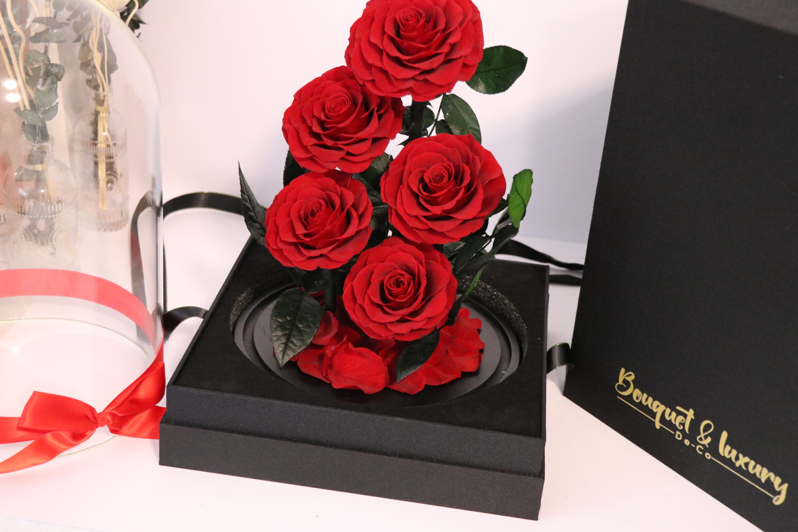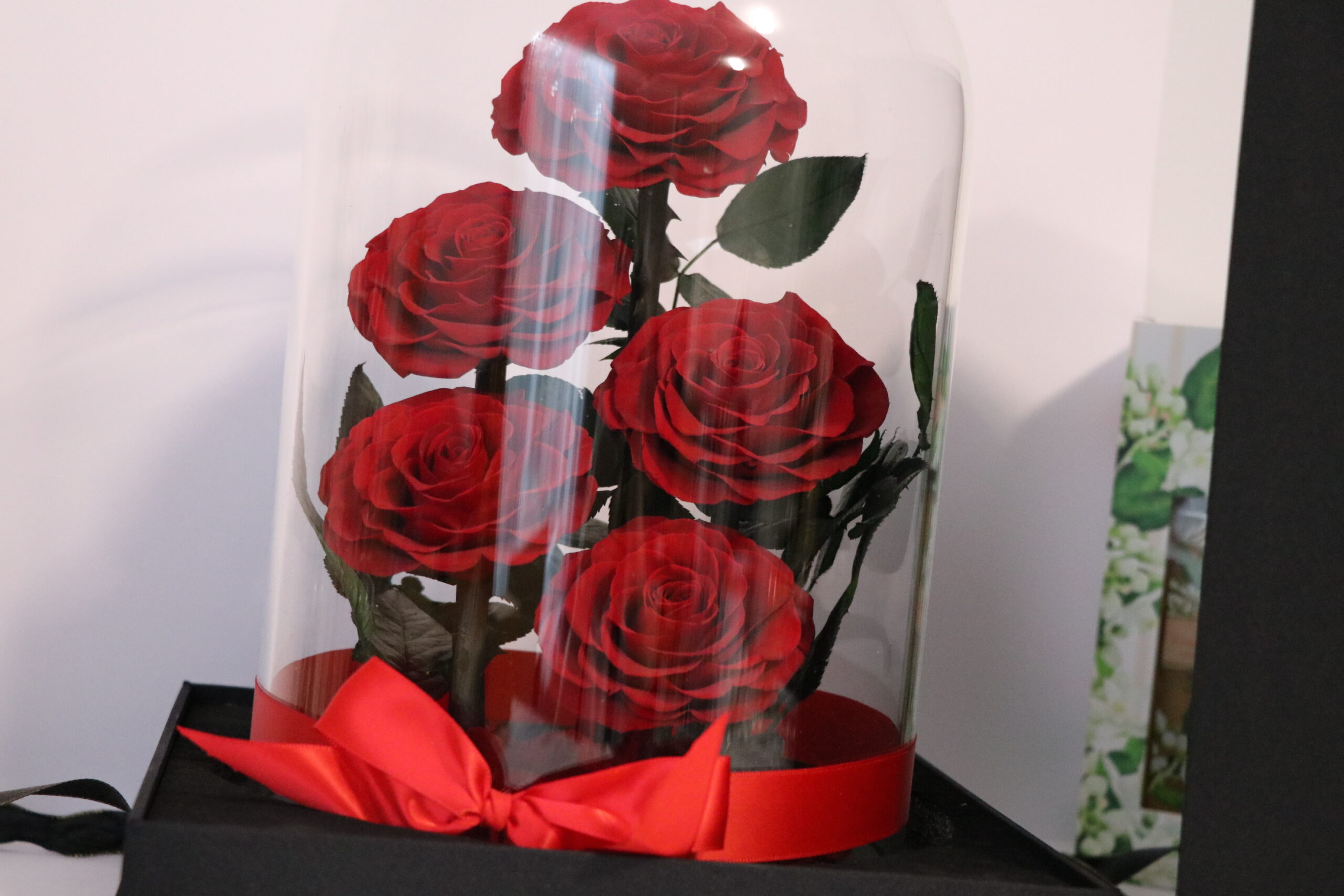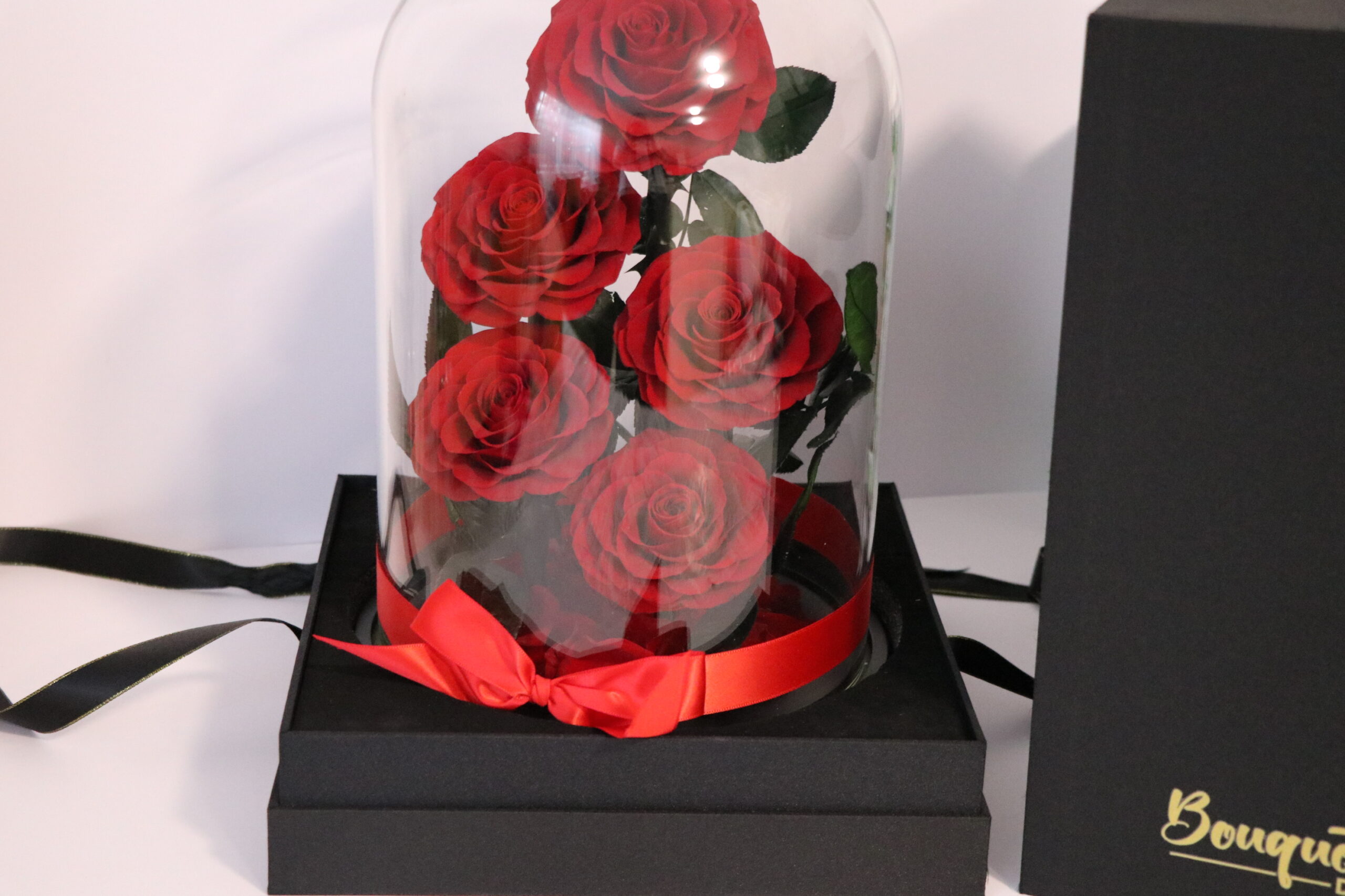 Everlasting Preserved- 5 Stems Roses Glass Dome – With Gift Box